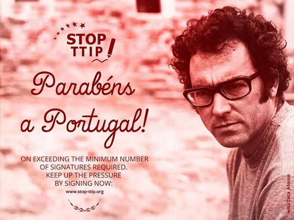 Em resultado das acções da Plataforma portuguesa Não ao Tratado Transatlântico e das organizações suas apoiantes, Portugal acaba de ultrapassar o quórum atribuído ao nosso país de 15.750 assinaturas. A Plataforma Não ao Tratado Transatlântico está a organizar a Semana Internacional de luta contra os tratados corporativos (CETA, TTIP, TISA) de 10 a 17 de Outubro, em simultâneo com as outras 500 organizações europeias.