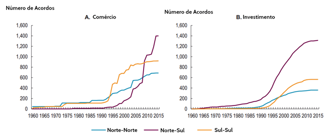 Entre 1990 e 2015, o número de acordos comerciais aumentou de 50 para 279, muitos dos quais plurilaterais e, portanto, envolvendo um número maior de pares de países […]. Os tratados bilaterais de investimento (TBIs) cresceram quase dez vezes, de 238 para 2239 no mesmo período […]. Essas mudanças legais foram projectadas para melhorar a integração económica internacional, impulsionar o comércio e o investimento transfronteiriço. No entanto, eles também facilitaram bastante as possibilidades de aquisição de activos tangíveis, transferência de activos intangíveis e especulação financeira. Como resultado, os principais actores e beneficiários dessa metamorfose do “comércio” não eram necessariamente as populações dos países envolvidos, mas os maiores actores empresariais envolvidos no lobby e na formulação das regras do comércio e finanças internacionais. Os acordos comerciais anteriores a 1990 eram principalmente entre países vizinhos, compartilhando níveis comparáveis de desenvolvimento económico e protecção do trabalho, com o objectivo de promover a integração regional por meio do comércio […]. No entanto, os acordos pós-1990 eram mais sobre o aumento da integração económica entre regiões e entre países desenvolvidos e em desenvolvimento, promovendo um comércio mais aberto (incluindo o processamento de comércio) e fluxos de capital liberalizados. Ao mesmo tempo, a “abrangência” de tais acordos continuou a aumentar, colocando sob o seu alcance muitas áreas políticas que até agora haviam sido excluídas das negociações comerciais. Historicamente, os acordos comerciais focavam questões relacionadas principalmente com taxas aduaneiras e cotas. Depois de 1995, as chamadas disposições “OMC-plus” incluídas na maioria dos acordos comerciais […] também cobriam regulamentos alfandegários, impostos de exportação, medidas anti-dumping, medidas de direitos compensatórios, barreiras técnicas ao comércio e padrões sanitários e fitossanitários. Outros acordos obrigaram ainda os signatários a fazer cumprir disposições que liberalizassem serviços financeiros ou aquisições públicas, com implicações de longo alcance para políticas públicas, emprego e distribuição de rendimento. Quanto às disposições “extras da OMC” […], que não são discutidas sob a égide da OMC, incluem um conjunto abrangente e em expansão de áreas de política, que muitas vezes reduzem ainda mais o espaço político dos países em desenvolvimento.