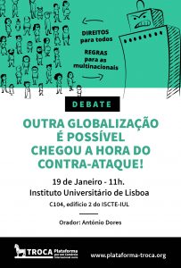 No dia 19 de Janeiro, pelas 11h, terá lugar em Lisboa, no edifício 2 do ISCTE-IUL, sala C104, um debate intitulado “Outra Globalização é possível – chegou a hora do contra-ataque!”.