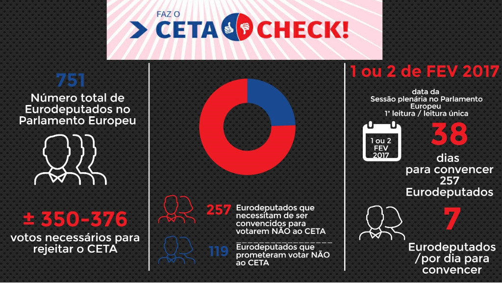 Até à data, 119 eurodeputados, 3 dos quais portugueses, comprometeram-se a votar contra o CETA. O CETA será votado com uma maioria plenária. Uma maioria plenária significa neste caso um total de ± 350 a 376 votos. Assim, cerca de 231 a 257 eurodeputados ainda precisam ser convencidos até a votação.